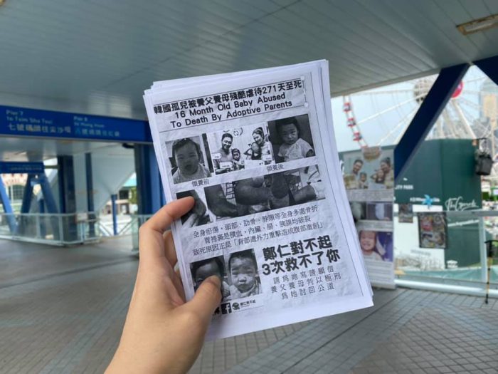 「可以幫幫這16個月大的孤兒嗎?」一名年輕媽媽一手牽着大兒子,一手抱着小女兒,狼狽又熟練地向途人派單張。單張上,一個笑容可愛的小女孩旁寫道:「韓國孤兒被養父母殘酷虐待至死,鄭仁,對不起。」