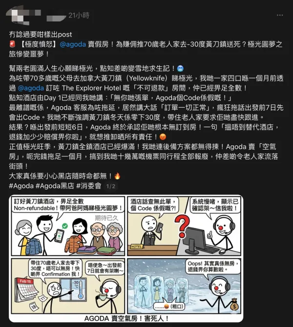 蛋花湯 發表於 26-2-26 10:34 有香港網民在社交平台控訴透過旅遊平台 Agoda 預訂加拿大黃刀鎮酒店,出發前夕才發現屬「空氣房」。事主帶 ...