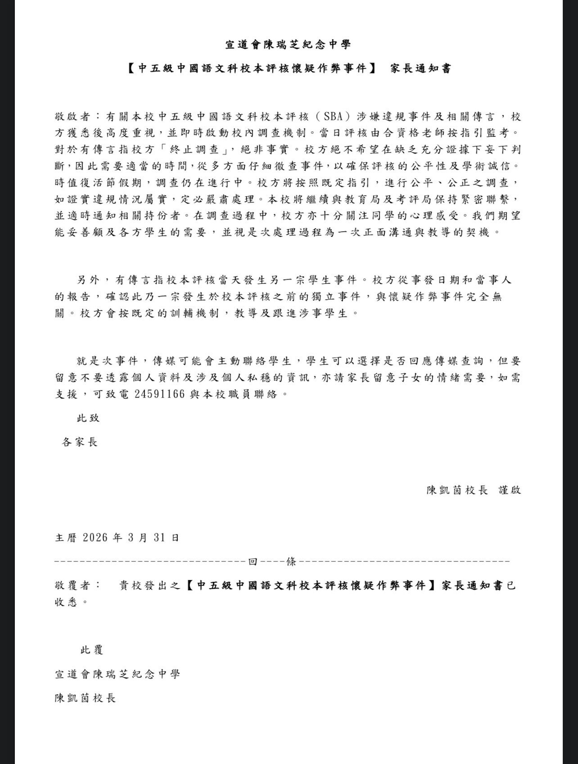 直至今日(31日),校方以「中五級中國語文科校本評核懷疑作弊事件」為題向家長發出通知書,指就中五級中文科SBA涉嫌違規事件及相關傳言,校方獲悉後高度重視,並即時啟動校內調查機制。校方指,當日評核由合資格老師按指引監考。