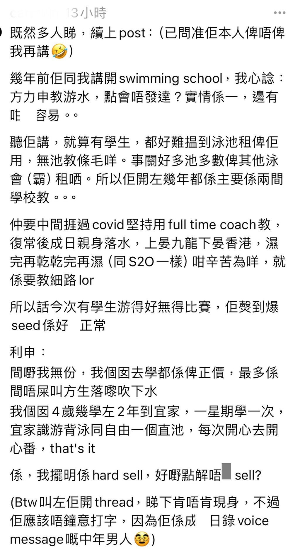 他又指:「中間捱過covid堅持用full time coach教,復常後成日親身落水,上晏九龍下晏香港,濕完再乾乾完再濕(同S2O一樣)咁辛苦為咩,就係要教細路。所以話今次有學生游得好無得比賽,佢㷫到爆seed係好X正常。」