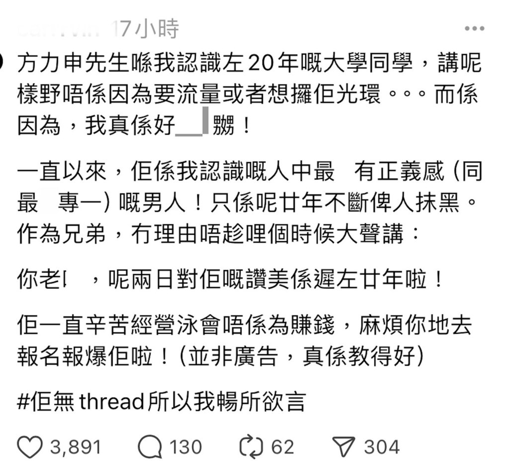 小方為小泳手發聲獲網民一致好評,更有人直言因事件對小方「改觀」。日前,有自稱是小方大學舊同學在Threads發文,為小方抱不平!