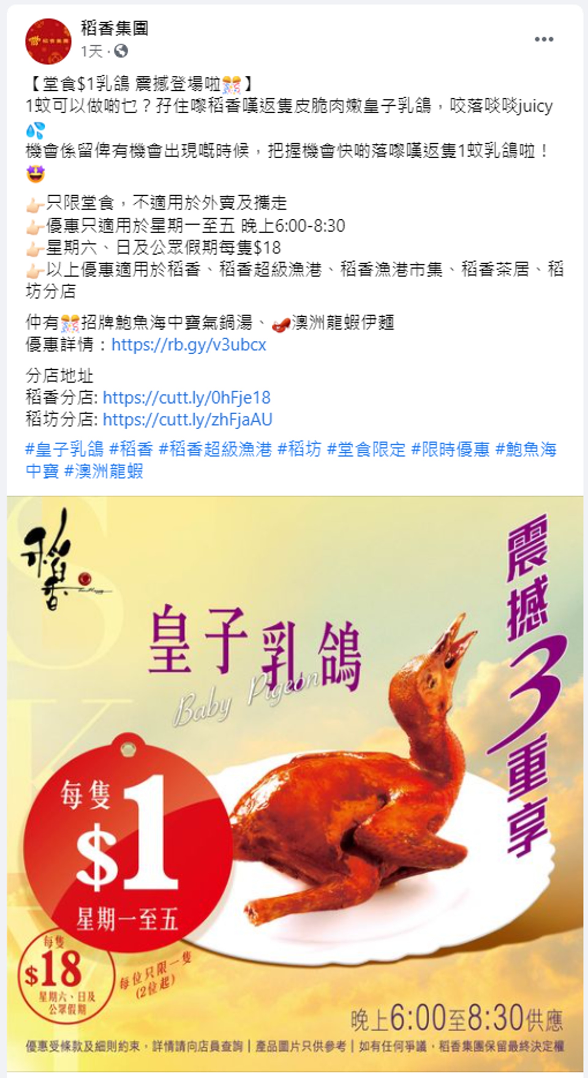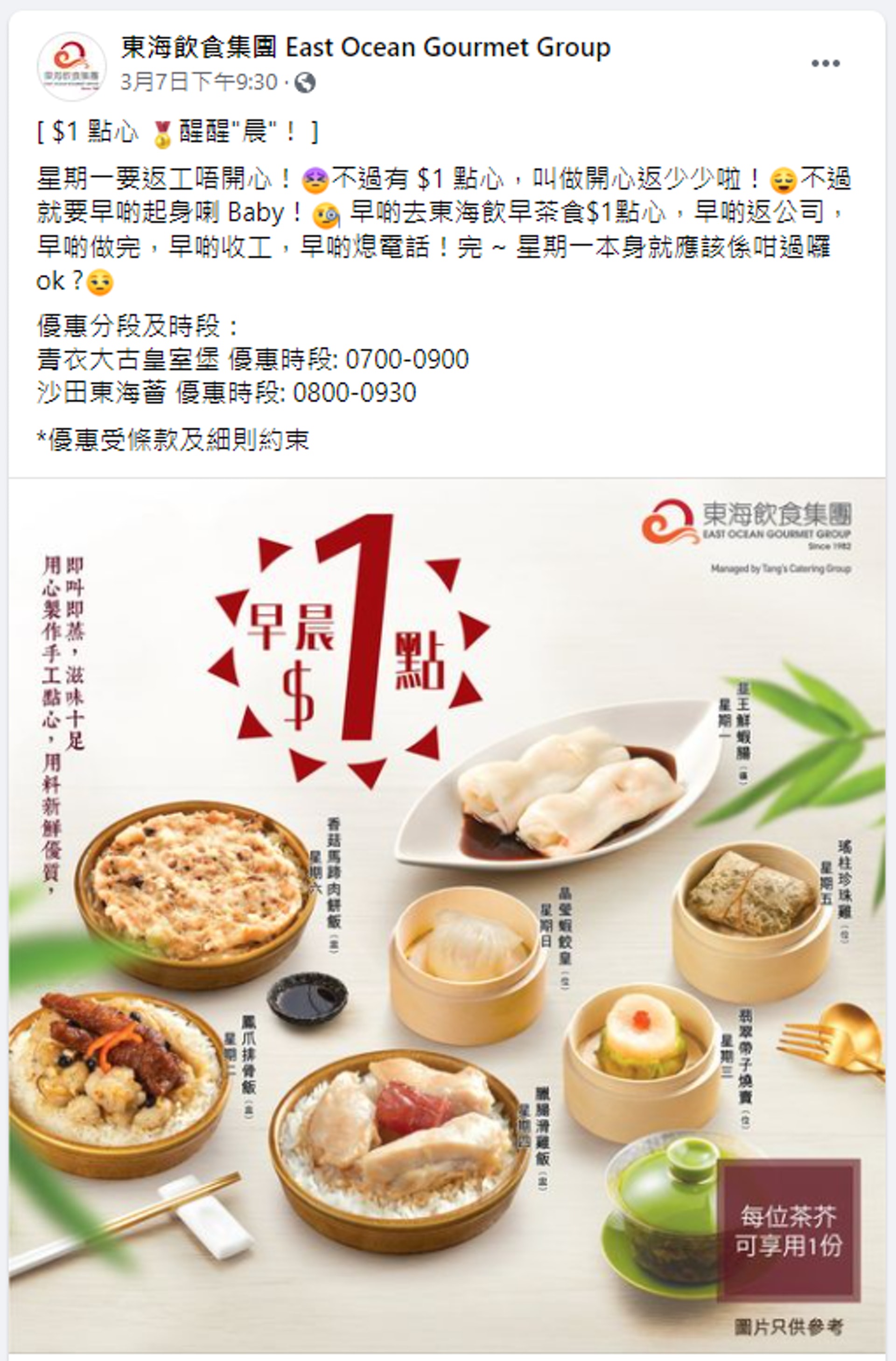 本月精選的$1優惠來自6個餐廳,包括稻香酒樓集團、東海飲食集團、KFC肯德基、Orange Elephant Thai Restaurant泰菜店、R.I.M.K.咖啡店及Daily 13。盛惠港幣1元的美食不止點心、乳鴿,還有任食甜品放題!