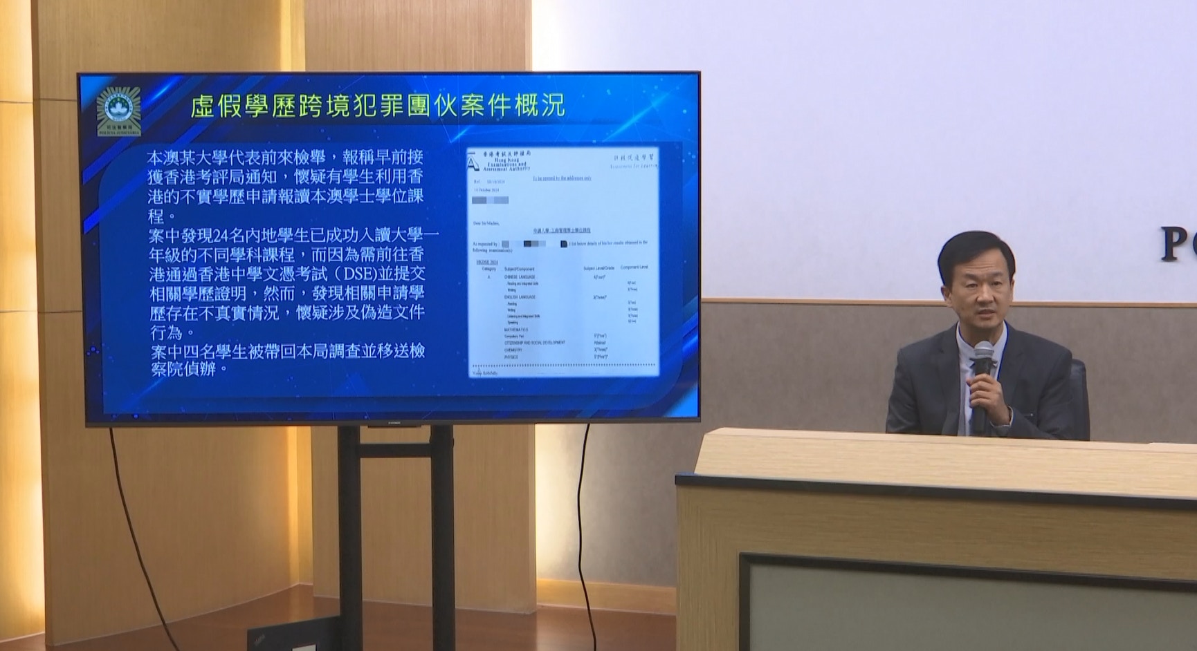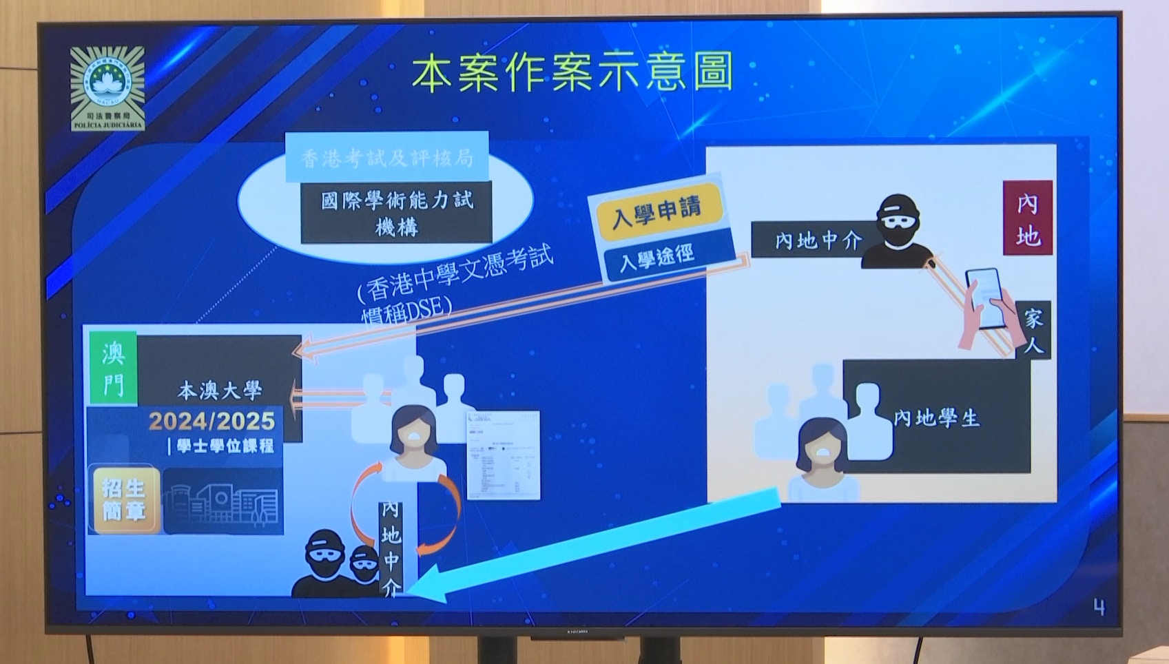 澳門司警表示,香港考評局10月28日通知澳門科技大學,懷疑有學生使用不實學歷申請入讀。澳科大一天後向司警報案,司警上月31日於大學宿舍拘捕四人,並於今月1日將他們移交檢察院。