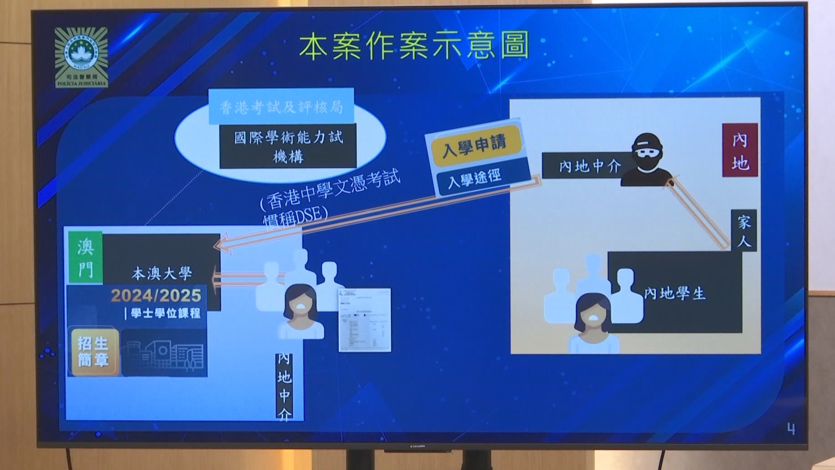 澳門司警今(18日)公布早前拘捕四名涉案大學一年級學生,承認自己從未應考文憑試,,透過內地中介偽造成績及證明,已被移交澳門檢察院處理。另外20人在校方報警前已離開澳門,澳門與香港及內地警方正合作追查。司警說內地中介甚至8月時派人到澳門,教學生辦理入學手續時如迴避職員問題。