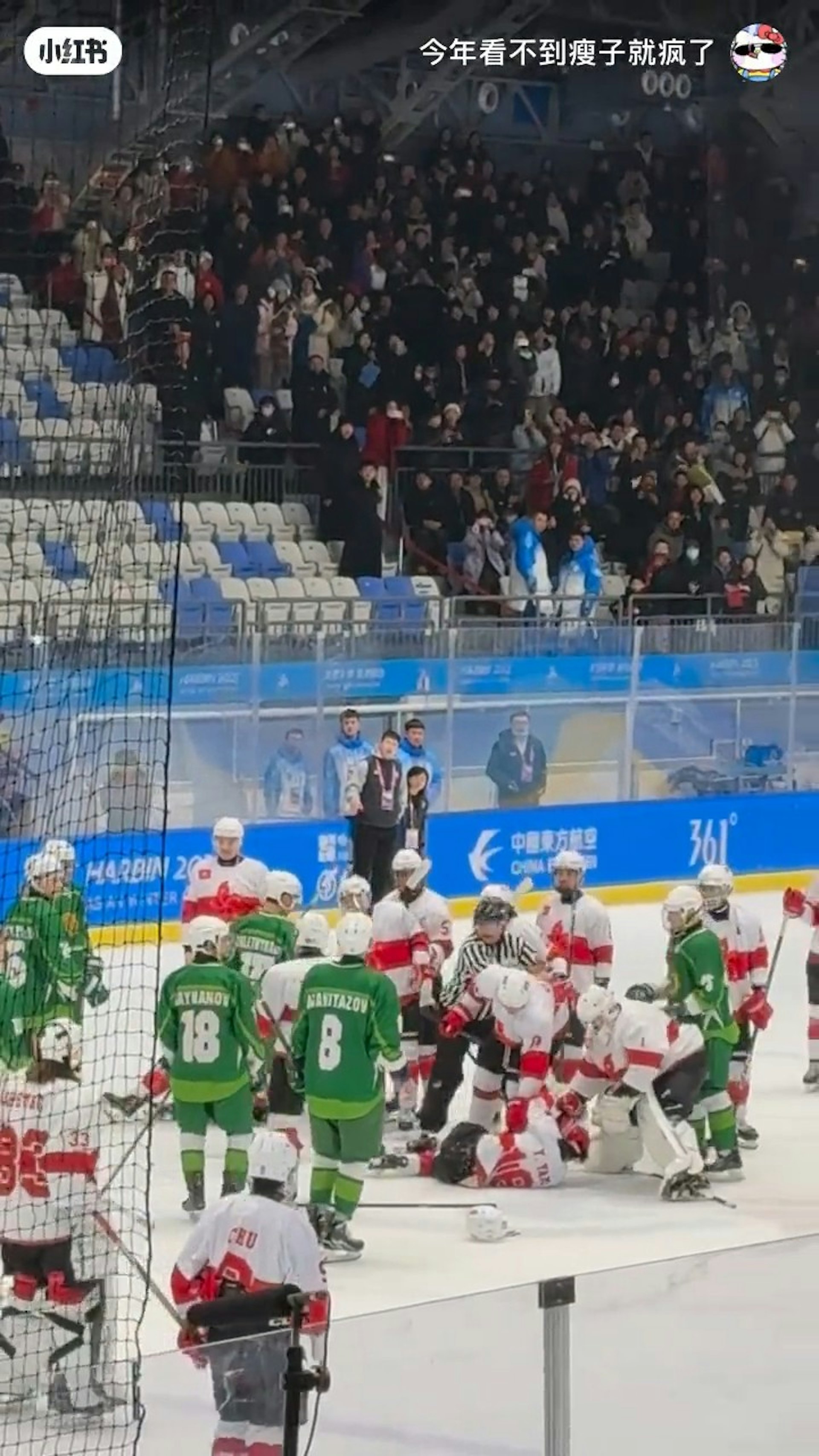 有小紅書用戶上載約35秒片段,顯示穿白衣的港隊球員與綠衣的土庫曼球員賽後握手。港隊4號球員突然被人拉着頭盔,他向前倒地。接着有人拿着頭盔向冰面揮動,穿黑白間條上衣的球證坐在地上,抱着一名港隊球員。
