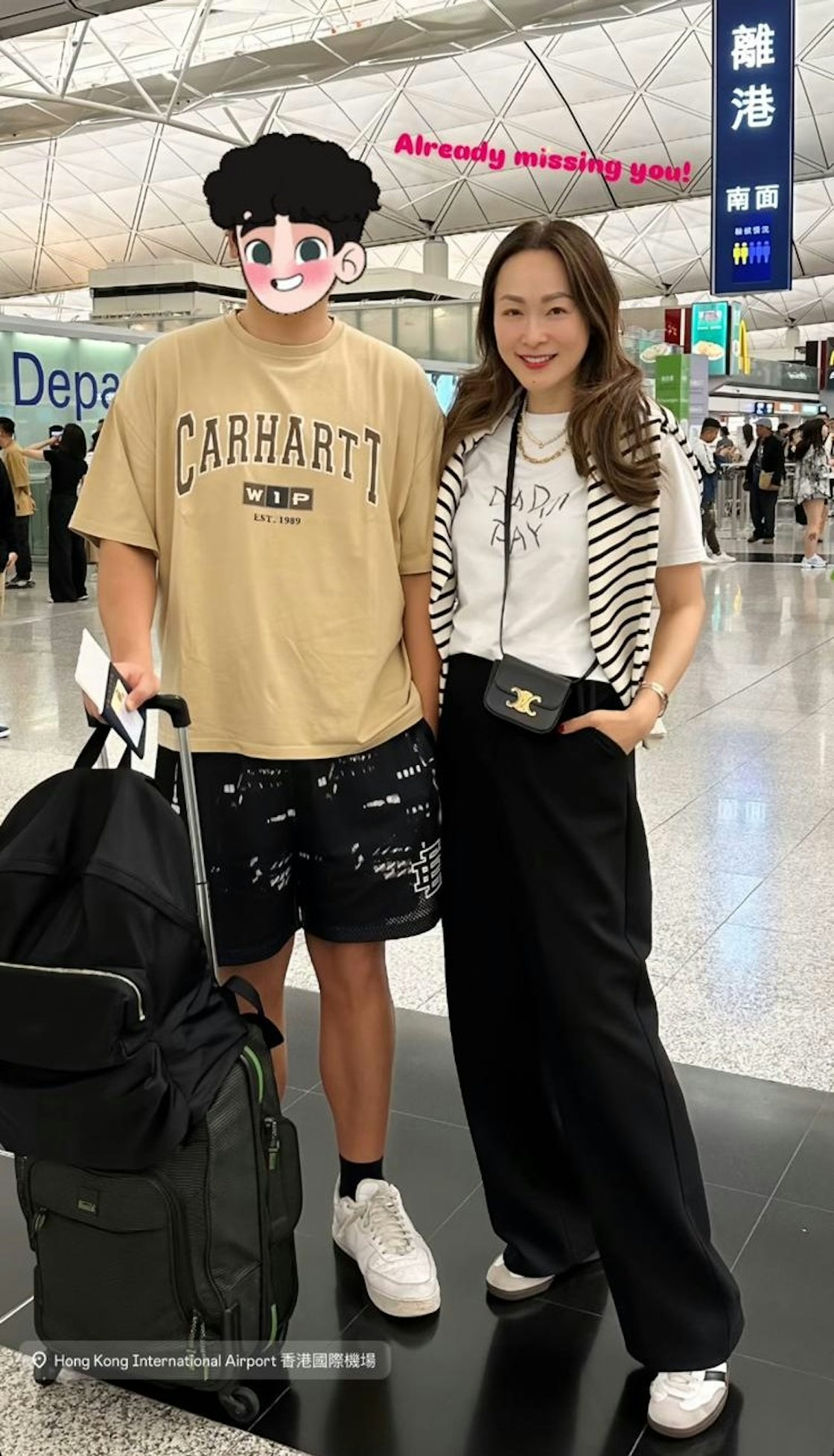 現年52歲的童愛玲在1993年拍攝電影《火蝴蝶》入行,曾與梁朝偉、黎明等男神合作,因而被封為「男神磁石」。童愛玲在2003年與台灣富商王敦民結婚後,便淡出演藝圈,至2022年才復出拍攝劇集飾演姜濤媽媽。而現實中童愛玲育有一子,而且兒子是學霸,早前她就到機場送兒子機,並曬出兩母子的合照,寫道:「Already missing you!(已經想你了!)」童愛玲來自台灣。(IG@eileentung)童愛玲當年曾與梁朝偉、黎明等男神合作,因而被封為「男神磁石」。(IG@eileentung)童愛玲曾與黎明合作拍攝和記電訊廣告「天地線」之《天地情緣》,成功令觀眾留下深刻印象。(影片截圖)《流氓醫生》。(影片截圖)童愛玲在電影《記得香蕉成熟時2:初戀情人》中飾演陳堅姐姐。(影片截圖)2022年復出拍攝ViuTV劇集《季前賽》,飾演姜濤媽媽。相中所見,童愛玲用Emoji遮擋了兒子的樣貌,但可見身形十分高大,比起173cm高的童愛玲還要高半個頭!據知童愛玲與富商老公王敦民是青梅竹馬,男方更是她的初戀情人,拍拖3年就結婚,婚後童愛玲誕下兒子王子毅,而身高6呎2的王子毅是NBA狂迷,原本在英國留學的他後來放棄留英讀法律,改到美國升讀名校華盛頓大學讀商科,亦可追逐籃球夢!送機。(IG截圖)好高大!