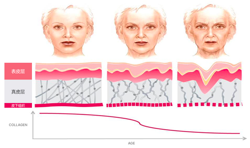 隨着年齡的增長,我們的皮膚會發生老化現象,膠原蛋白和彈性蛋白減少,膠原蛋白合成量、真皮層的密度、皮膚彈性也隨之減少,從而產生皺紋、毛孔變大、皮膚變得乾燥等問題。
