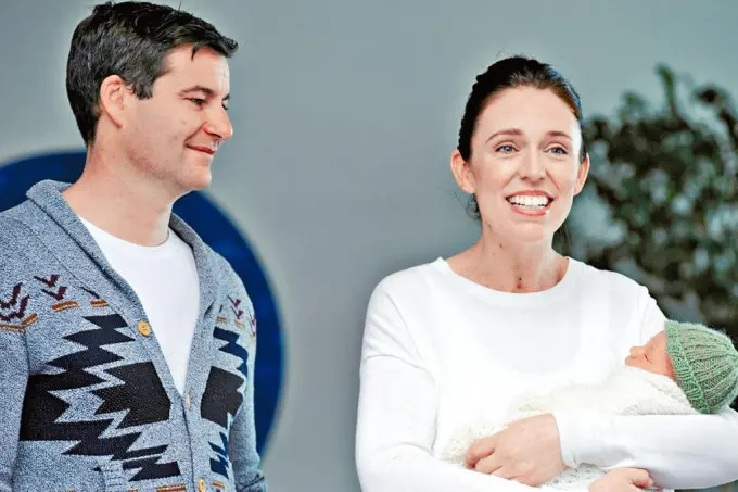 紐西蘭總理阿德恩二○一八年抱着初生嬰兒,與伴侶蓋福德離開醫院。