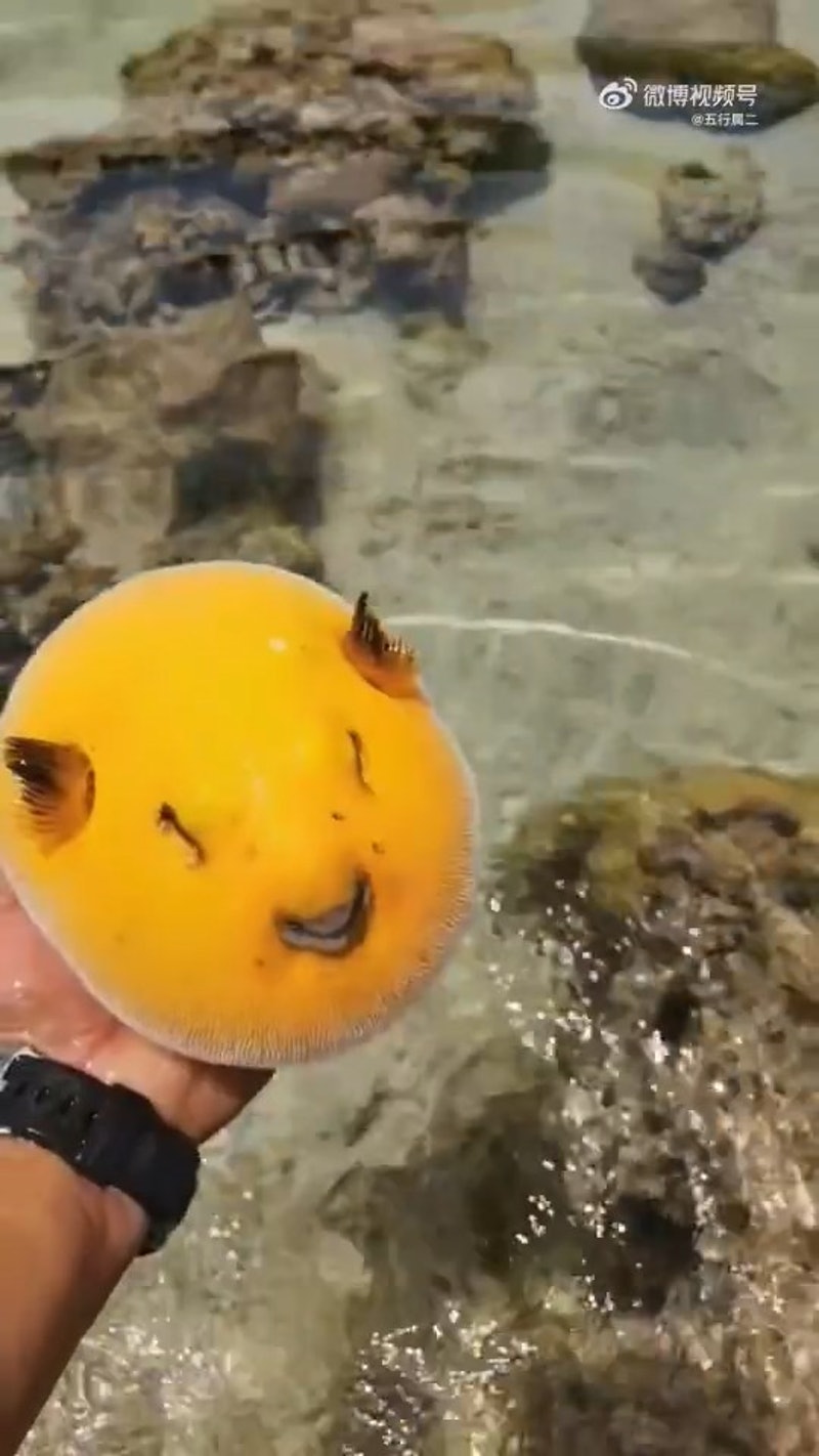 網友表示:「好像一顆噴汁的大芒果」、「嘴巴發紫是被自己毒到了嗎」、「牠怎麼在漏水?」、「河豚還有顏色限量版?」、「好像擬人化的黃桃或枇杷」、「撈上來吐水的樣子超喜感」、「海綿寶寶裡的泡芙阿姨?」、「被你打擾看牠都氣鼓鼓了」、「感覺吐出來的水都是甜的」。