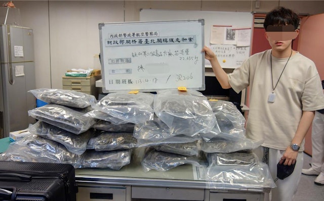 台灣傳媒報道,當地財政部關務署台北關與航空警察局今年4月查獲一宗重大跨國毒品走私案件,24歲姓陳香港青年與一名62歲泰國婦人,涉嫌利用由曼谷到台灣轉機回香港時販運毒品,執法人員在二人的託運行李篋中發現共重45.304公斤的大麻,市值初估逾新台幣9,000萬元(折算港幣2,175萬元),桃園地方檢察署經過近5個月調查偵辦,於今日宣布破案。