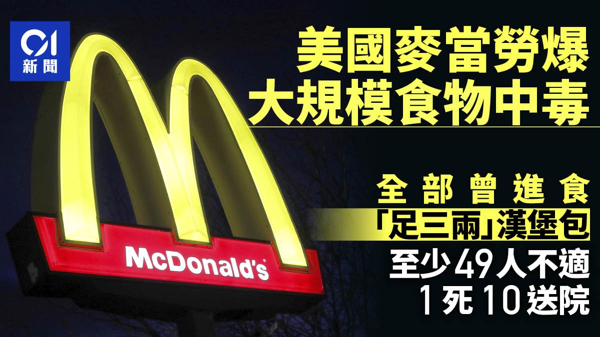 美國疾病控制與預防中心(CDC)10月22日表示,當地麥當勞推出的「足三兩」漢堡包(Quarter Pounder)涉因大腸桿菌引發大規模食物中毒,在10個州造成至少49人不適,當中1名長者死亡,10人需要入院治療,其中1名兒童腎臟出現嚴重併發症。