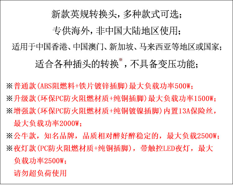 轉換头买"負載功率"大于家電。 不超負荷就安全。