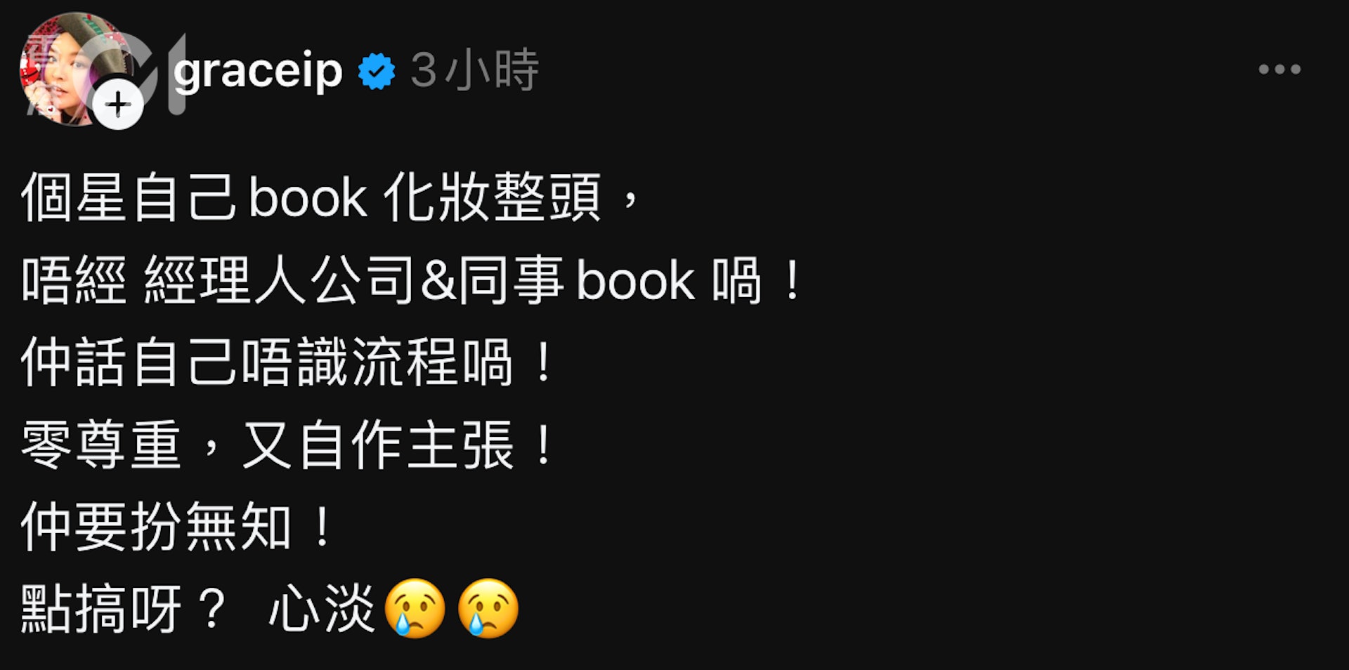 葉佩雯同老公郭偉亮去年,開始為少女組合XiX別擔任形象總監及經理人,日前她在threads發帖︰「個星自己book化妝整頭,唔經經理人公司&同事book喎!仲話自己唔識流程喎!零尊重,又自作主張!仲要扮無知!點搞呀?心淡」並附上兩個喊喊emoji。