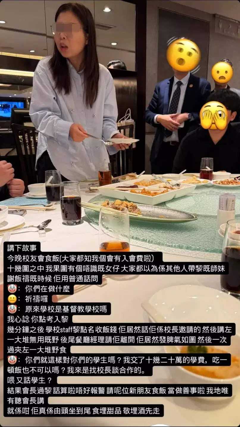 蛋花湯 發表於 25-1-8 09:17 最終,樓主引述校友會會長希望大事化小,小事化無,該名女子便坐到最後才離開,「結果(校友會)會長過嚟 ...