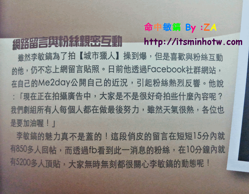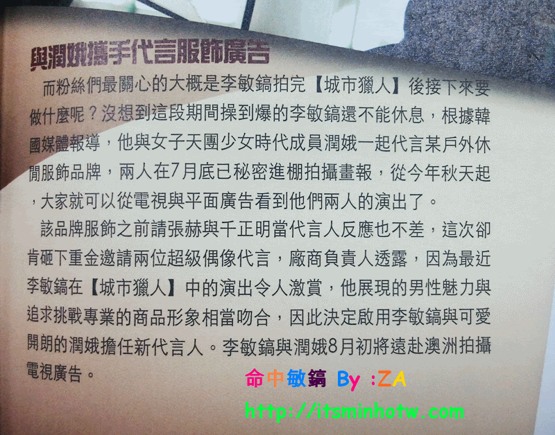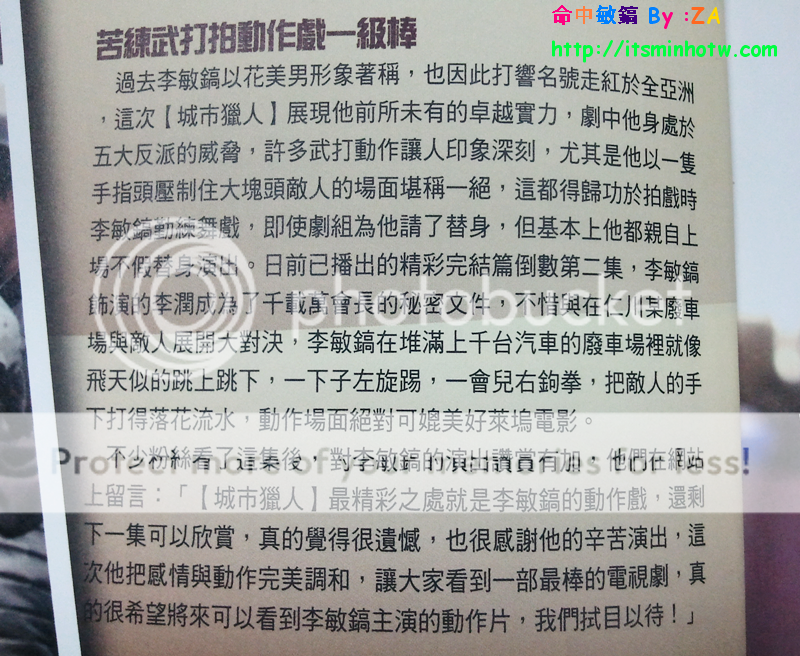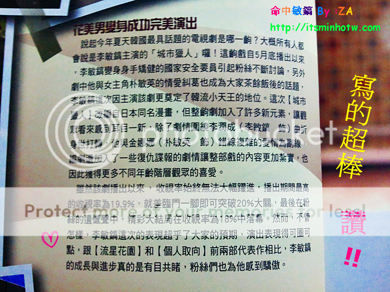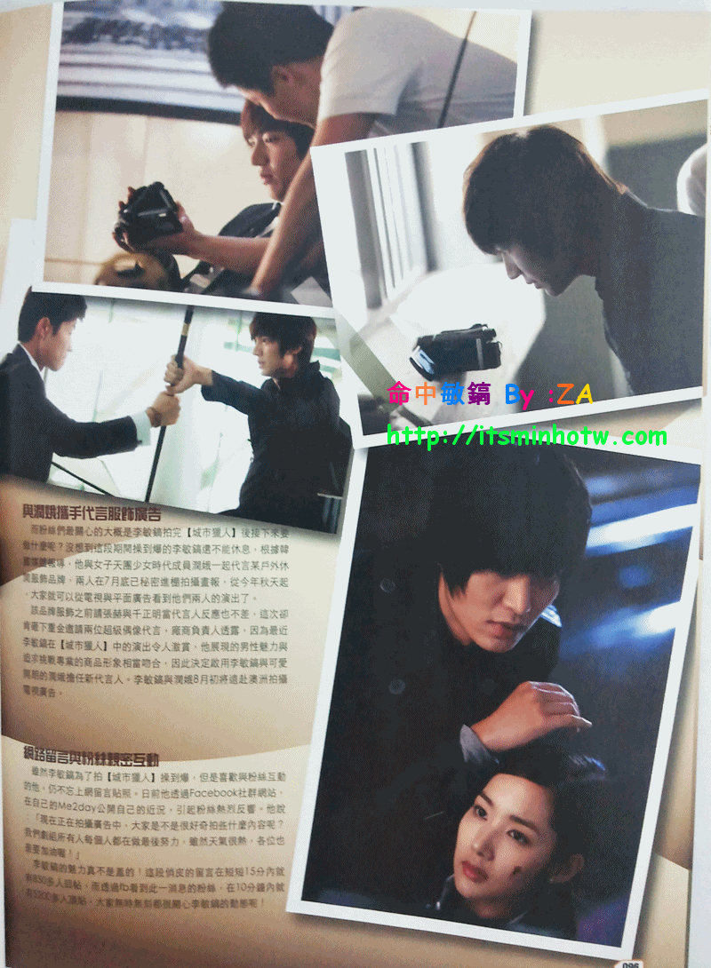 李:之前「花男」這個標籤讓我變成了閃亮的明星,而《城市獵人》則給我機會展現了作為一個演員的實力,可以說我朝著演員的目標又邁進了一步。《城市獵人》後我收到了很多劇本,風格題材各異,多虧了這部劇,我的戲路得到了拓展。李敏鎬台灣第一國際fansclub-★命中敏鎬-minho in destiny' S) F- I; R4 i3 w B; V) V& l