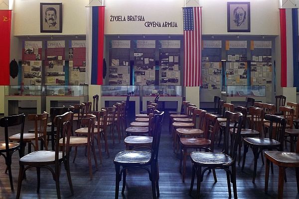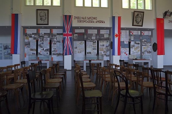 我們進入AVNOJ博物館參觀,大人2Km,兒童1Km,在前南斯拉夫時期這裏是個朝聖的地方,其門如市,現在非常冷清。AVNOJ全名是南斯拉夫反法西斯人民解放委員會(the anti-fascist Council for the National Liberation of Yugoslavia),是由鐵托領導的二戰時組織,抵抗分割南斯拉夫的軸心國,AVNOJ在 1942年11月於比哈奇成立, 1943年11月在亞伊采舉行第二次會議,改為國家立法機構,決定南斯拉夫由六個民族成立共和國組成聯邦,由鐵托擔任元帥和總理,剝奪王國流亡政府權利及不讓流亡的南斯拉夫王回國。會議所在的亞伊采被視爲南斯拉夫社會主義聯邦共和國的誕生地,而會場就被改爲博物館,展示當時開會時的情況。舞台前中央處有座鐵托的雕像.