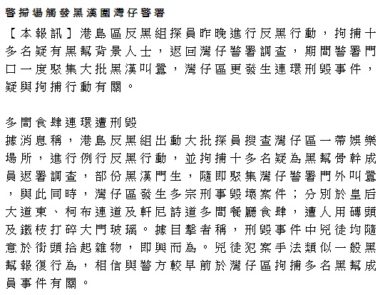 bchan77 發表於 21-9-28 20:03 馬兄,⎾聊堪告慰⏌(如果可以用呢個詞嘅話)嘅係,兩幫人都係打拳頭交,冇出刀出棍,赤手空拳造成對火鍋店 ...