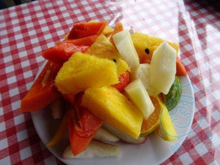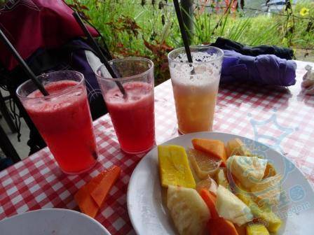 跟住再去Tropical Fruit Farm, 兩大一小入場費 RM98, 己經到左午飯時間有D 肚餓, 吳生話Tropical Fruit Farm 有得食. 我&C6諗都好, 頂住先. 買票后 負責人會按你貼紙上号碼叫上車, 我地咁啱夾左一班强國人一架車, 到左山頂之后果園導遊介紹一D比較熱門嘅水果, D大陸人為求影相, 不惜踩住D菠蘿田, 叫極吾好都聽吾到, 導遊好無奈。後來落大雨, 避左一陣, 導遊就帶我地去食水果buffet, 沿路介紹水果. 到左食水果buffet 地方, 有好多水果, &鮮搾果汁, 估吾到都食得飽. D强人除左踩水果田, 食buffet 時, 一手攞住竹簽一面吉, 一面就放入ロ, 人地有個夾比佢用, 但已經等吾切, 排隊就更加無。