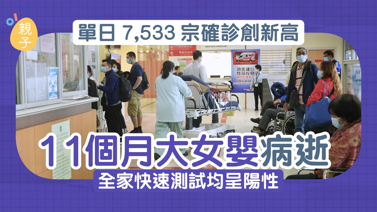 第五波疫情再創單日確診新高,今日(21日)新增7,533宗確診,而且過去24小時內有13人死亡,死亡個案年齡介乎11個月至97歲,涉及7男6女。而最年幼的11個月女嬰健康狀況一直良好,但曾出現持續抽促,在2月19日上午到將軍澳醫院急症室求診,測試後發現陽性,而情況持續惡化,心肺功能一度停頓,最終搶救不治於昨(20日)黃昏6時59分離世。醫管局已把個案提交至死因裁判庭跟進,而女嬰的家人及照顧者則快速抗原測試呈陽性。