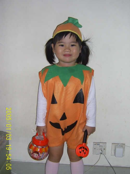 dolphin 寫道: 熙熙學校都係今日開party, 但個名就唔係Halloween Party啊,係english party, 可能怕d人扮得過激, 嚇親d小朋友, 我都係幫佢扮南瓜, 帶埋頂橙色頭髮帽同手拿南瓜小袋