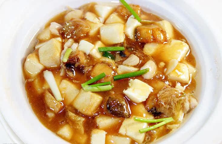 2、猪肉切滚刀块,泡发好的墨鱼去骨去皮,切成小条;