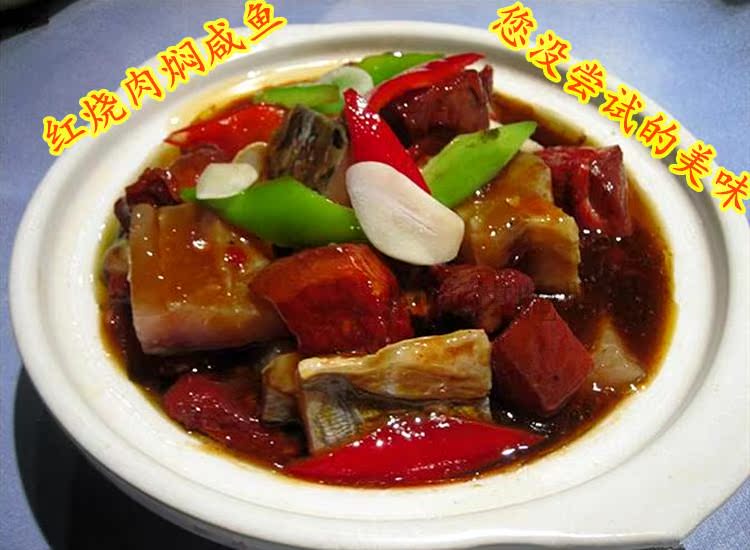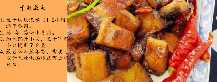 鱼干1整只、猪肉500克、八角2个、大蒜头5-8个、干辣椒2个、油2勺、生抽2勺、老抽1勺、冰糖1勺、水1碗、老酒半勺。