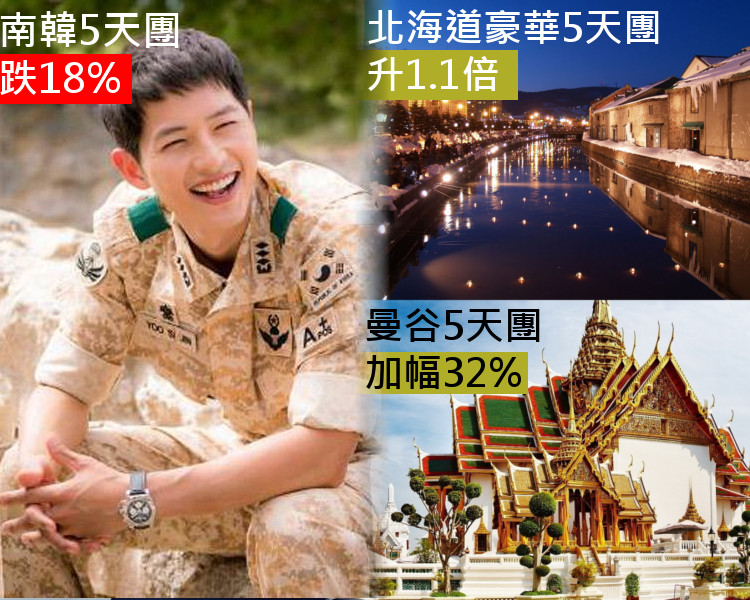 普通團中,曼谷5天團普遍團費,由去年的2499元升至3299元,加幅三成二,韓國5天團最抵,由去年3999元跌至3299元,跌一成八;港人另一旅遊熱點台灣,台北和高雄的團費都跌7-8%。至於豪華團,曼谷5天團不升反跌,較去年平三成七,由8899元大減至5599元。加幅最大的,是日本北海道5天團,升幅達1.1倍,團費由去年的16199元,急升至33999元。去內地華東5天團也減價三成六,團費由5499元減至3529元。