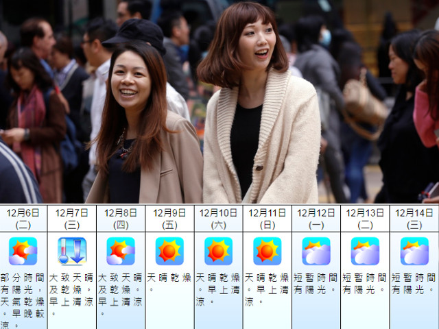 周三氣溫變化預料感覺最大,大致天晴及乾燥,早上清涼,氣溫最低17度。周四大致天晴及乾燥。早上清涼,最低氣溫只有16度。根據自動分區天氣預報,周四清晨7時,大埔、上水、沙田及將軍澳等地只有13至14度。不過現時預測,周五氣溫又會再略為回升,至最高23度,最低18度。