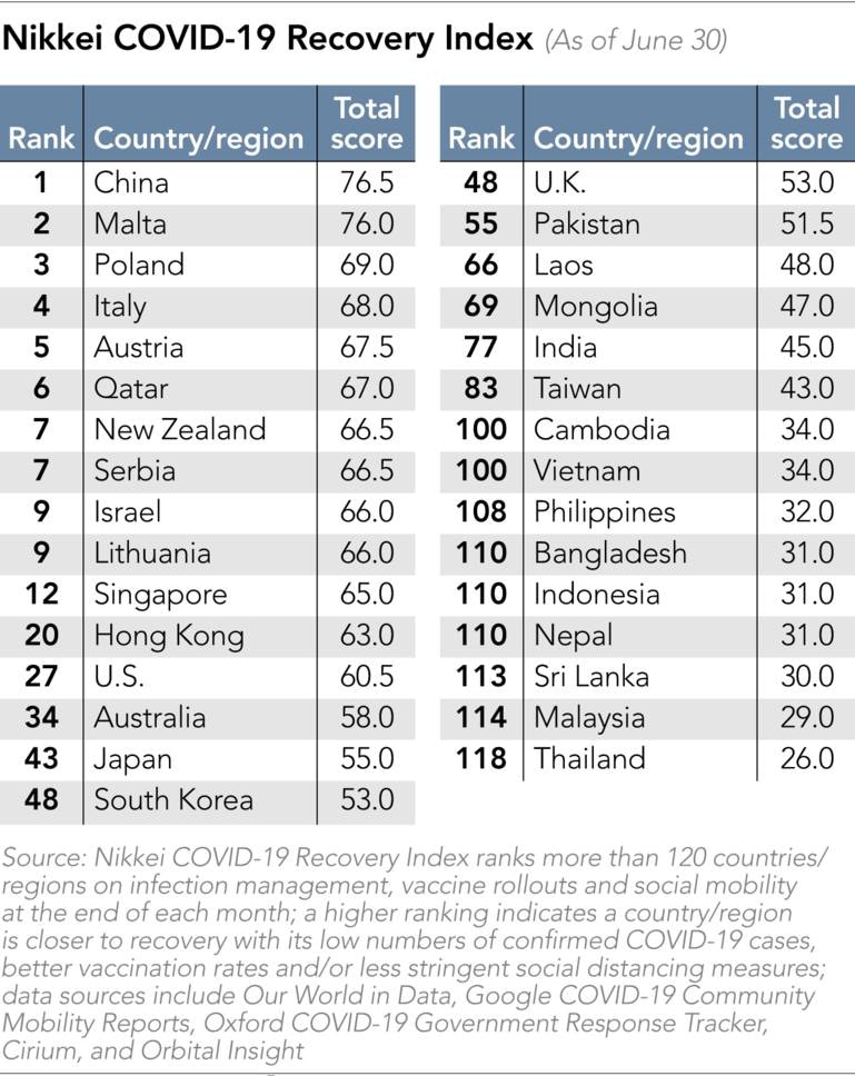 日本經濟新聞發布各國擺脫新冠疫情復甦情況的「日經新冠復甦指數」顯示,截至六月底,台灣在全球一百 ...