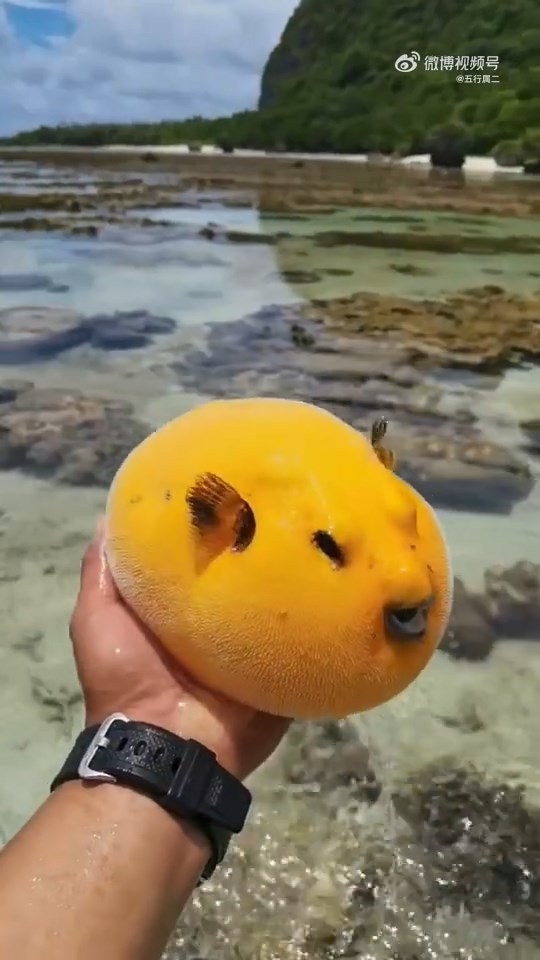 網友表示:「好像一顆噴汁的大芒果」、「嘴巴發紫是被自己毒到了嗎」、「牠怎麼在漏水?」、「河豚還有顏色限量版?」、「好像擬人化的黃桃或枇杷」、「撈上來吐水的樣子超喜感」、「海綿寶寶裡的泡芙阿姨?」、「被你打擾看牠都氣鼓鼓了」、「感覺吐出來的水都是甜的」。