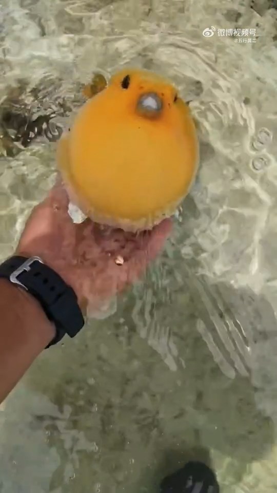 一名網友分享在河裡看到一隻金黃色的河豚,覺得很稀奇,單手把牠撈上來。這隻金河豚一上來就從嘴裡嘩啦啦吐出一堆水,原PO把牠放在手掌心抖動,還當皮球小拋了一下,輕捏河豚的身體牠又從鰭的孔洞洩出一些水,玩了數十秒後把河豚放回水裡。