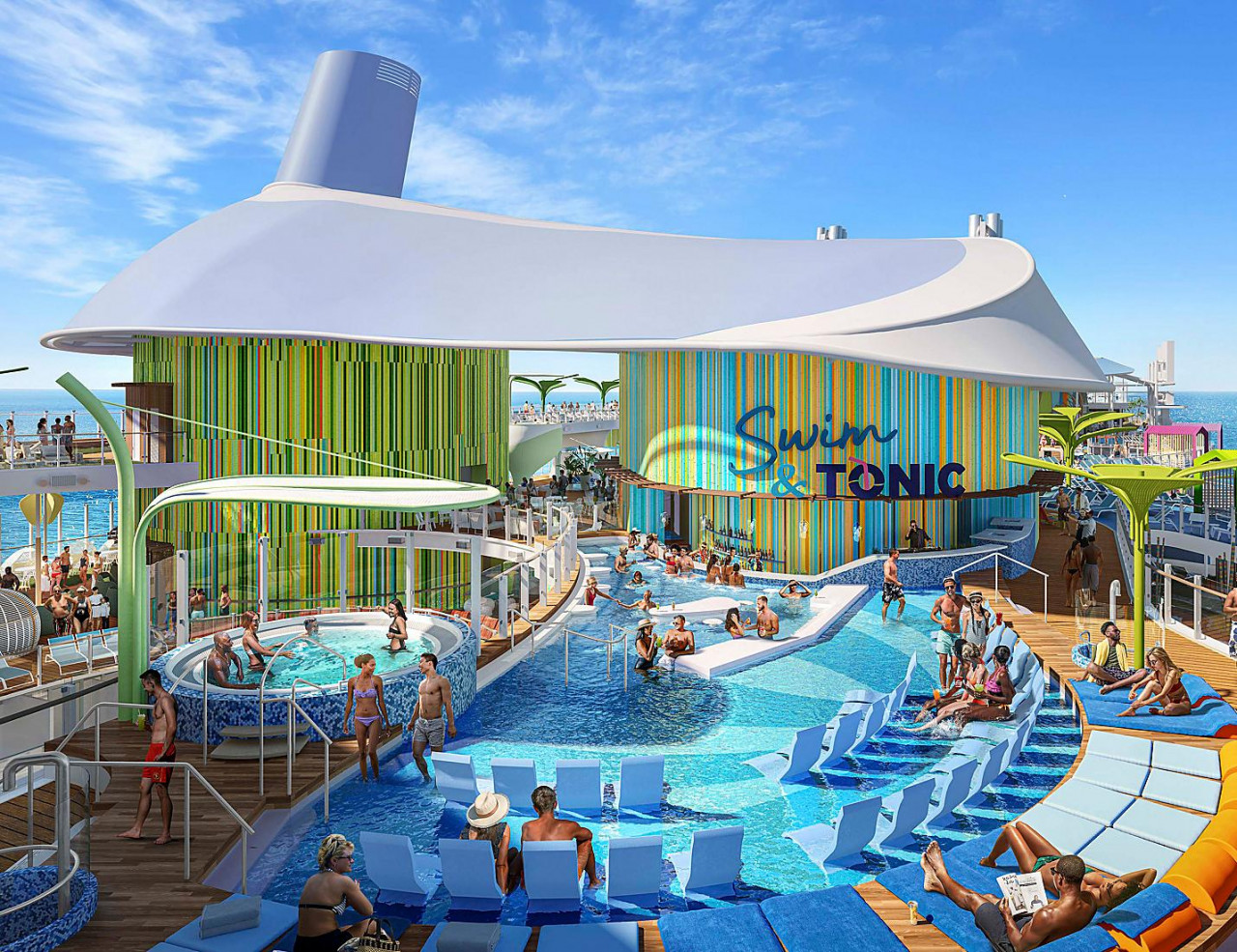 如果想休閒感受海風,郵輪上特設7個不同類型的泳池和9個按摩浴缸,當中包括全球首個泳池懸浮水上酒吧(Swin & Tonic),全球首個海上無邊際泳池 - 「世外桃源泳池」(The Hideaway ),令旅客無任何建築物阻擋下欣賞最迷人的日落景緻!
