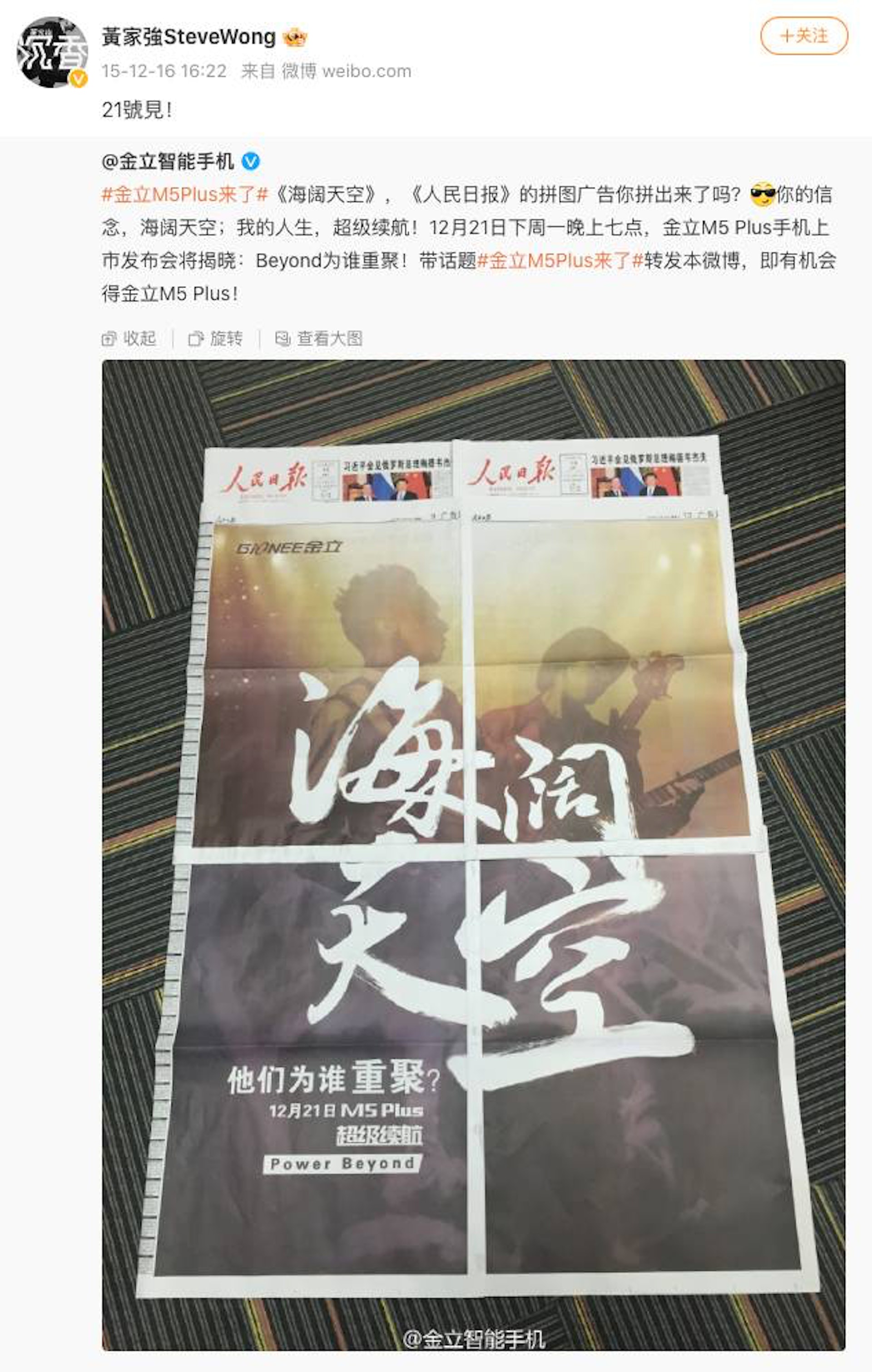 黃家強曾聲稱自己不會再用BEYOND的名字生存,但在2015年12月16日內地一手機商在《人民日報》登四個不同版本的宣傳廣告。將四個廣告合併後組成「海闊天空」四個字,而背景則是家強和家駒兩兄弟演奏的畫面,黃家強亦在其微博轉發貼文。有大批網民都圍攻鬧爆家強「發死人財」、不尊重哥哥家駒。