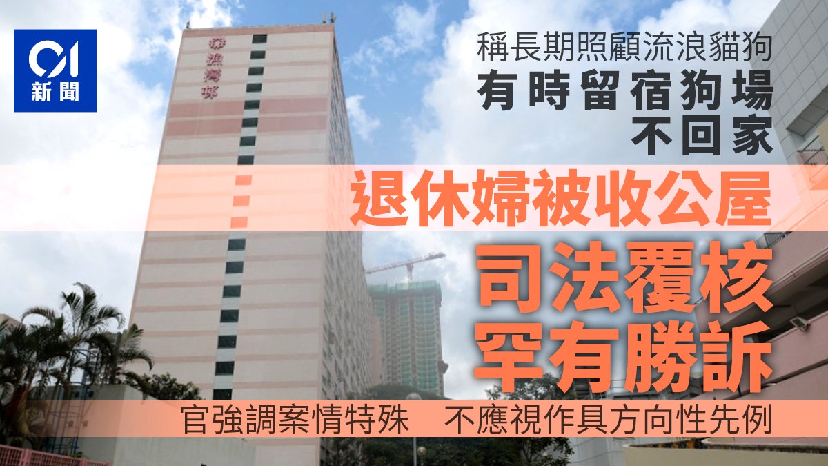 居於柴灣漁灣邨的六旬退休婦,因房署多番家訪無人在家,加上水電錶讀數低,被收回公屋。她事後解釋因要照顧流浪貓狗,元朗的狗場又欠缺義工,惟因地點距離柴灣居所甚遠,有時會在狗場留宿而少回家,又指其單位現已無電力供應,但她有住屋需要。房委會的上訴委員會以退休婦長期不在單位居住為由,駁回其上訴。退休婦遂提出司法覆核,但無出席聆訊。高等法院法官楊家雄今(21日)頒判辭,認為退休婦在狗場留宿屬臨時性質,房委會亦指若退休婦有提出申請,會有其他合適政策處理,法官因而裁定退休婦勝訴,發還上訴委員會重新考慮,又強調本案情況特殊,不應被視為任何具方向性的先例。