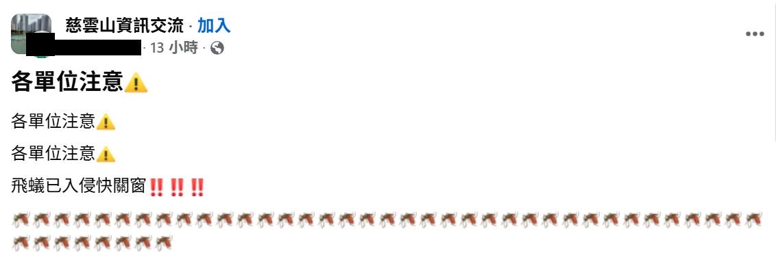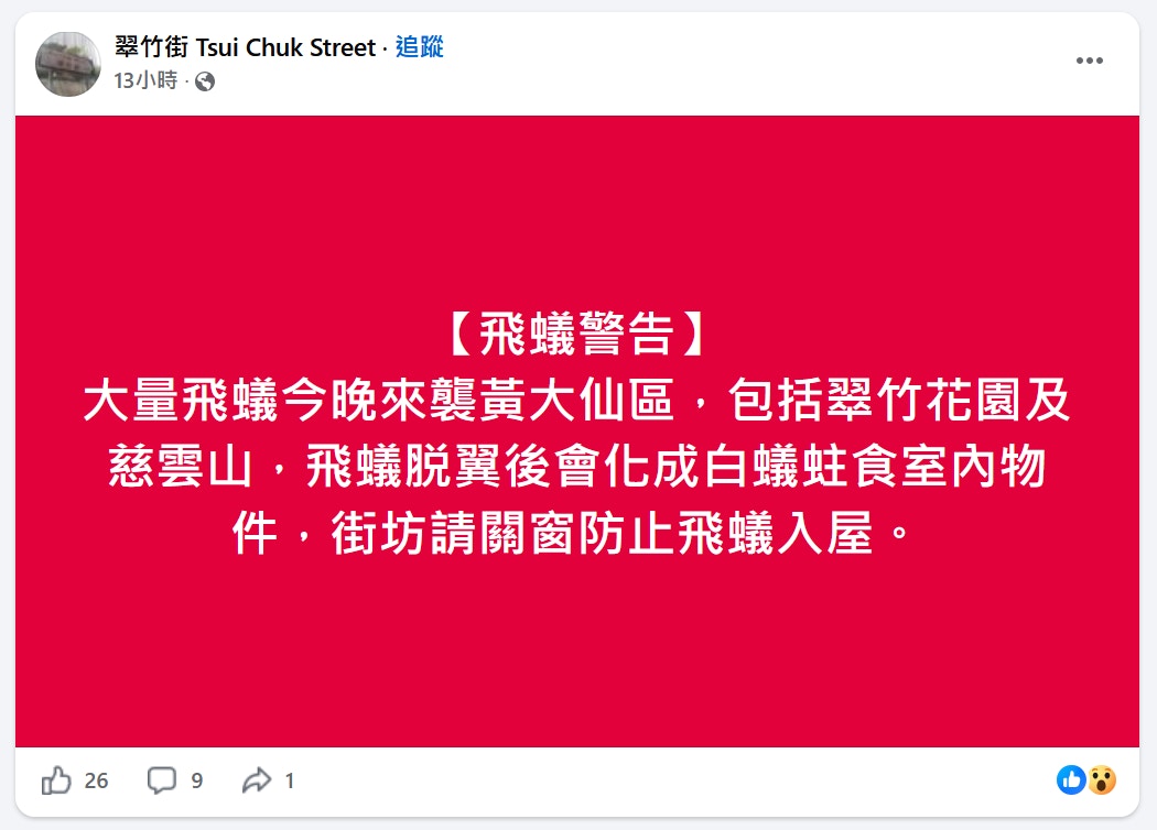 yaabb 發表於 26-4-2 13:37 踏入4月香港天氣不穩驟雨連連,更有飛蟻大軍「入侵」黃大仙區!多名街坊於網上黃大仙群組發相發文警告,慈 ...